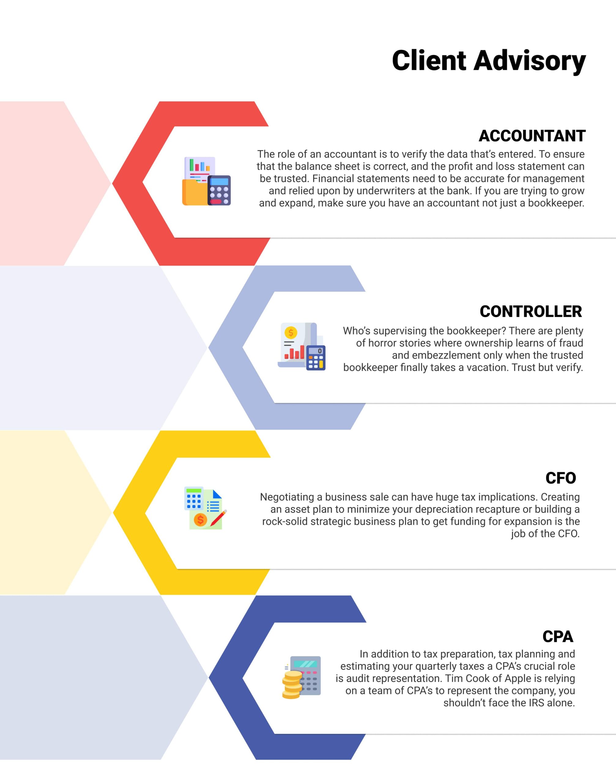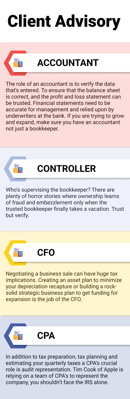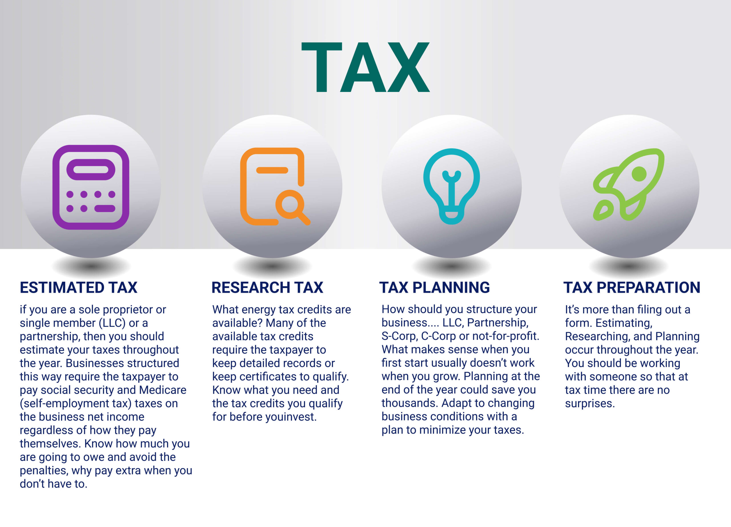 A year long journey that ends with the filing of a tax return. It starts by making sure the accounting is correct and continues through the year by generating financials, estimating taxes, overseeing the bookkeeping, and audit representation.