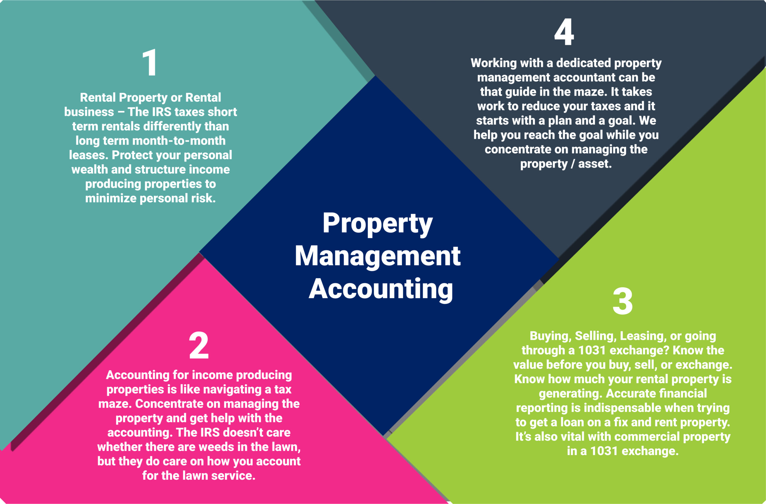 Unlike the property manager, the property accountant has tax responsibilities that can include multiple states and jurisdictions. Staying on top of the tax code and ensuring you are compliant is our top mission.